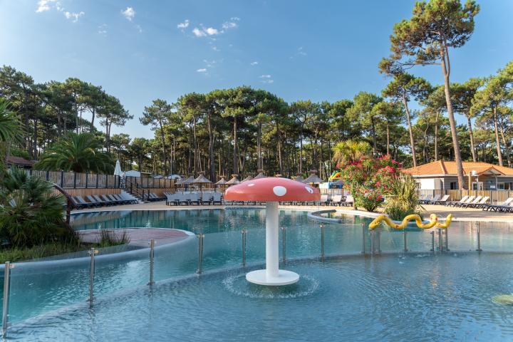 - 2 piscines extérieures chauffées avec bain à remous, toboggan, pataugeoire avec jeux, jardin d'eau et plage de transats
